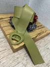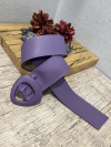 Cinto em material sintético com aspecto de couro e fivela em formato triangular também revestida no mesmo material.